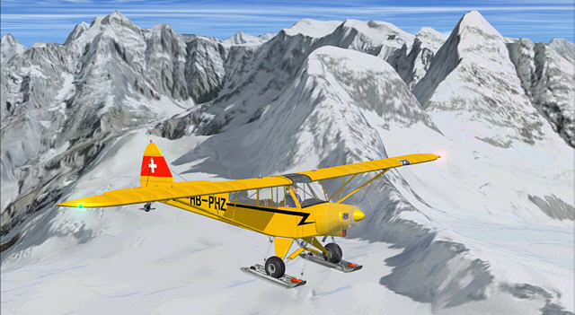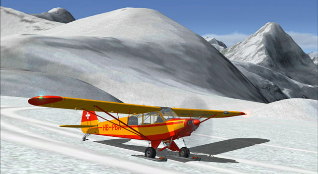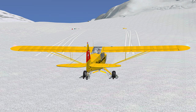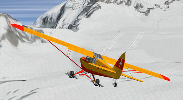 Natürlich war ich gespannt zu erfahren, wie sich das alles im FSX erleben lässt. Die mitgelieferte Piper PA-18 Super Cub ist das klassische Gletscherflugzeug schlechthin und wohl am meisten vertreten. Obwohl sie ihren Erstflug 1949 hatte ist sie dank ihrer einfachen, robusten Bauweise und guten Flugeigenschaften heute ein begehrtes Liebhaberobjekt und weltweit im Einsatz. Die Navigation im FSX ist dank GPS vereinfacht, aber wer VFR trainieren will, sollte es mit der Karte machen. Zu Beginn empfiehlt sich ein möglichst geringes Abfluggewicht für eine bessere Performance. Immerhin bewegt man sich auf Höhen jenseits der Baumgrenze und bekanntlich nimmt die Motorleistung mit schwindender Dichtehöhe deutlich ab. Meine ersten Versuche mache ich auf dem Kanderfirn. Dieser hat gleich drei Landemöglichkeiten in verschiedene Richtungen. Zur besseren Erkennung tragen die auffälligen Skispuren bei. Die Plätze können zur besseren Erkennung aber auch über eine bestimmte Nav-Frequenz rot eingerahmt werden. Gelandet wird bergauf, gestartet bergab. Es braucht schon Nerven, auf Hängen zu landen, die wie im Add-On zwischen 2,5 und 10,5 Grad geneigt sind. Dabei werden ebenso reale Sounds vom Aufsetzen wiedergegeben wie visuelle Effekte des aufgewirbelten Schnees. Zum Parkieren muss man nach der Landung eine 90-Gradkurve fahren und die Skier hochfahren, um den Vogel richtig zu parken, sonst macht er sich selbständig. Im Parkbereich stehen statische Flugzeuge und ein paar Leute oder ein Zelt. Die Super Cub. ist besonders auf diese virtuellen Schneelandungen angepasst. Auf dem Gletscher wird das Gemisch automatisch eingestellt. Wichtig ist zu erwähnen, dass die FSX Default-Szenerie wie auch FS Global nicht kompatibel sind.